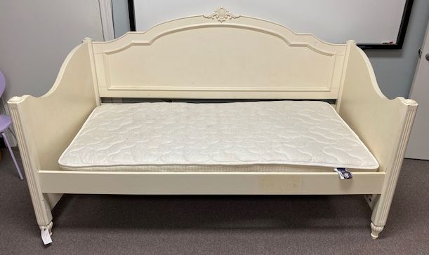 Modern White Day Bed, factory white, antique style, good condition, has Serta mattress, 48"h., 80"w., 40"d. Modern White Day Bed, factory white, antique style, good condition, has Serta mattress, 48"h., 80"w., 40"d.