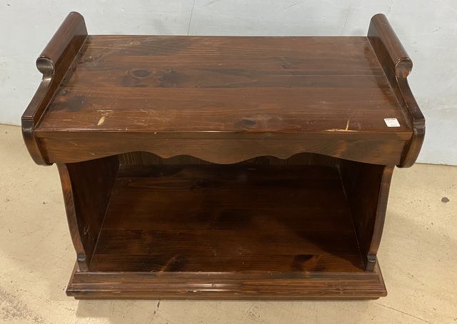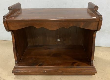 Vintage Pine Rolling Stand, two tier, has scratches and worn areas, 26"h., 31"w., 15"d. Vintage Pine Rolling Stand, two tier, has scratches and worn areas, 26"h., 31"w., 15"d.