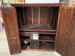 Large Oak Finish Computer Cabinet, two folding doors, has wear and mildew exposure, 60"h., 53"w., 27"d. Would Make a Cool bar. Large Oak Finish Computer Cabinet, two folding doors, has wear and mildew exposure, 60"h., 53"w., 27"d. Would Make a Cool bar.