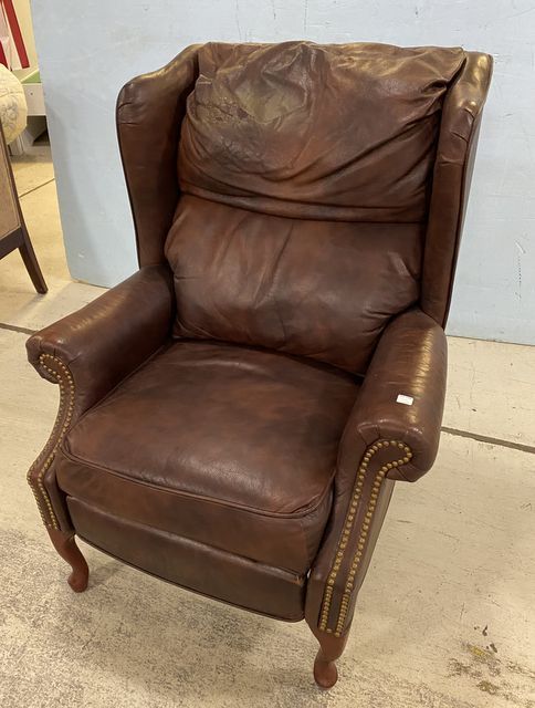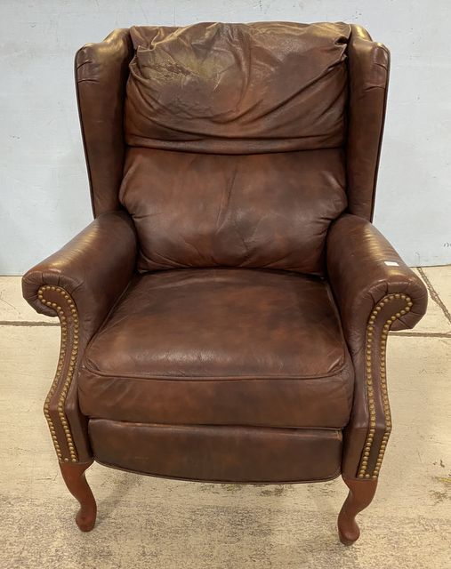 Leather nail head recliner, head rest is worn areas, has wear. Leather nail head recliner, head rest is worn areas, has wear.