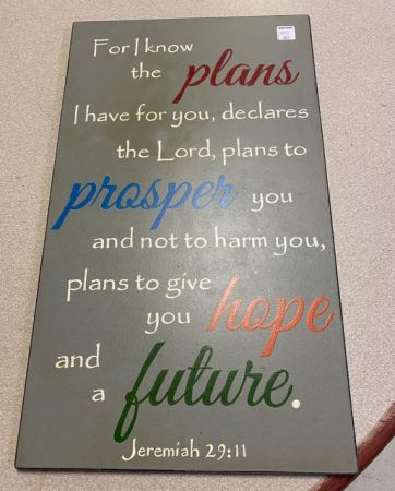 Wood Wall Plaque Jeremiah 29:11, painted verse, 24"h., 14"w. Wood Wall Plaque Jeremiah 29:11, painted verse, 24"h., 14"w.