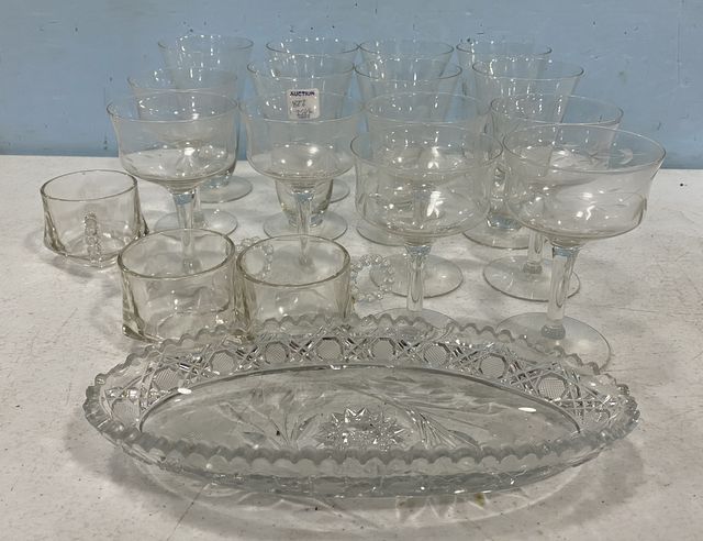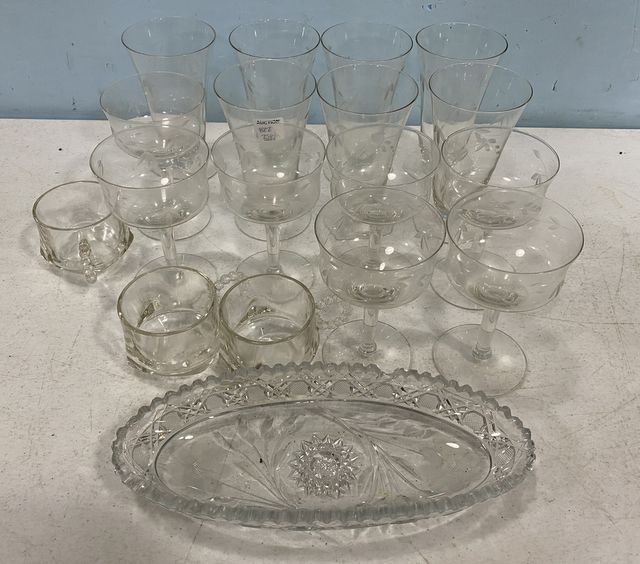 822 Group of Etched Glassware, Punch Cups, and Cut Glass Dish