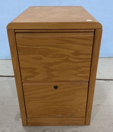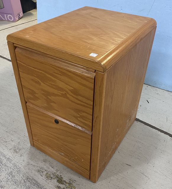 Wood two drawer file cabinet, oak finish, no keys, light mildew, 30"h., 19"w., 24"d. Wood two drawer file cabinet, oak finish, no keys, light mildew, 30"h., 19"w., 24"d.