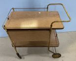 Vintage Tea serving cart, two tier, brass frame, on wheels, maple finish, has worn areas, and wear. Vintage Tea serving cart, two tier, brass frame, on wheels, maple finish, has worn areas, and wear.
