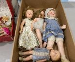 Group of Vintage dolls, Two dolls boxes, one empty, one full, larger dolls in box. Group of Vintage dolls, Two dolls boxes, one empty, one full, larger dolls in box.
