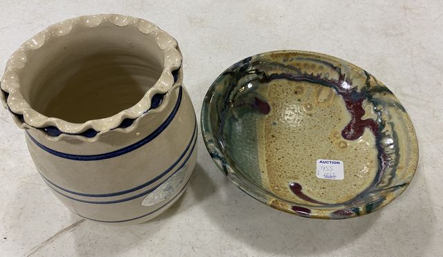 955 Marshall Pottery Blue Label Crock and Signed Pottery Bowl