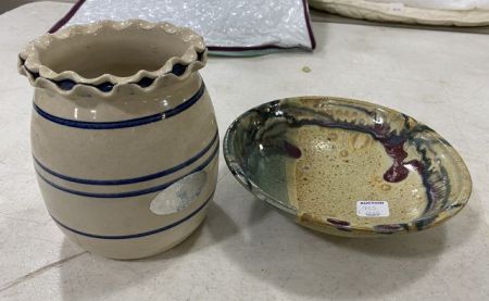 Marshall Pottery Blue Label Crock, signed by Artist and Signed Pottery Bowl Marshall Pottery Blue Label Crock, signed by Artist and Signed Pottery Bowl