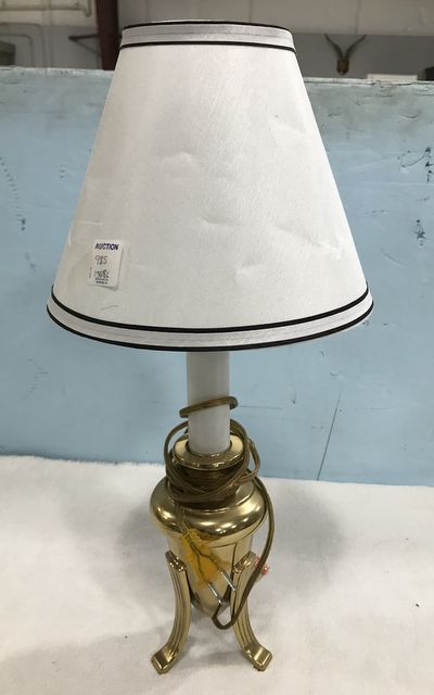 Small Footed brass Chest lamp, shade has dents, 19"h. Small Footed brass Chest lamp, shade has dents, 19"h.