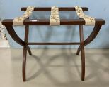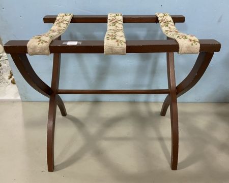 Vintage Luggage Stand, fold out with needle point straps, has finish wear. Vintage Luggage Stand, fold out with needle point straps, has finish wear.