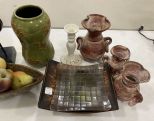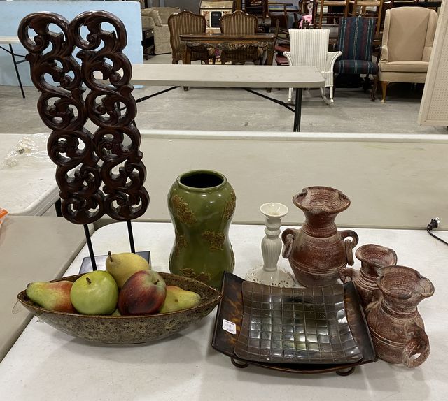Table plaque on stand, pottery vases, metal candle trays, ceramic fruit planter, white candle stick. Table plaque on stand, pottery vases, metal candle trays, ceramic fruit planter, white candle stick.