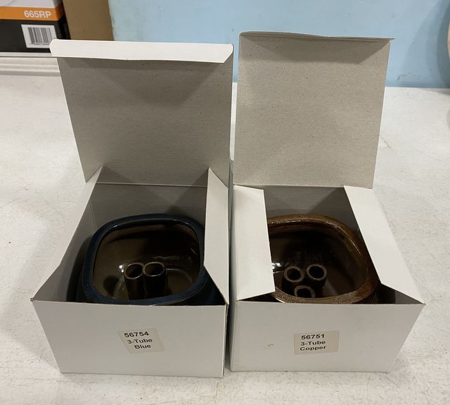 Four Hand Made Pottery Candle Holders, 3 tube blue, 3 tube copper, 3 tube copper, 3 tube copper. Four Hand Made Pottery Candle Holders, 3 tube blue, 3 tube copper, 3 tube copper, 3 tube copper.