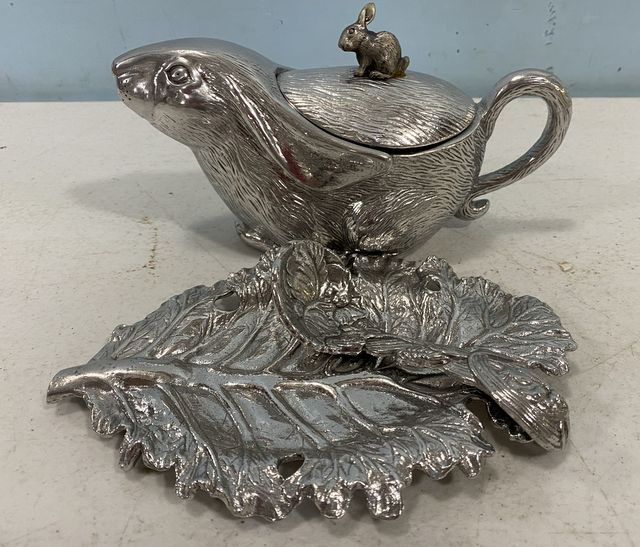 Arthur Court Rabbit Tureen 8"w, Ladle, and Leaf Dish, in box. Arthur Court Rabbit Tureen 8"w, Ladle, and Leaf Dish, in box.