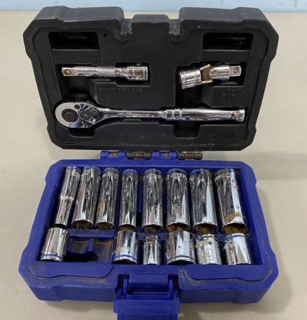 Kobalt Socket set, missing two sockets, in case. Kobalt Socket set, missing two sockets, in case.