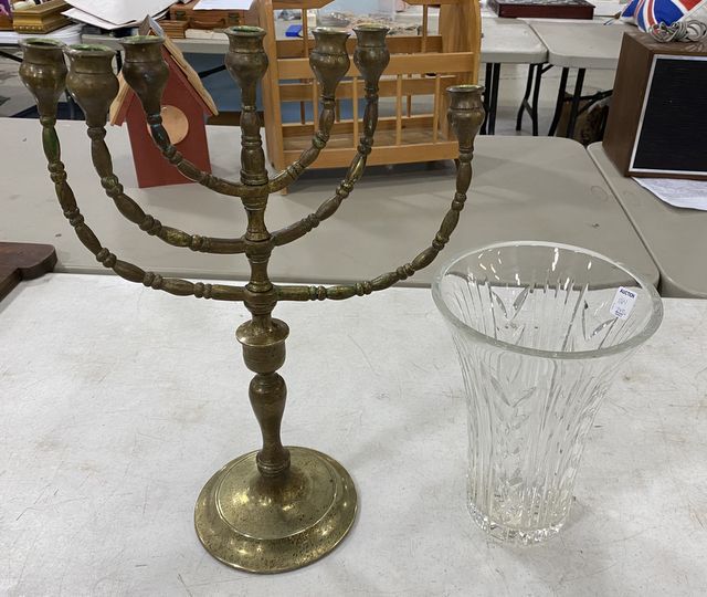 Brass Candelabra and Crystal Glass Flower Vase 10"h. Brass Candelabra and Crystal Glass Flower Vase 10"h.