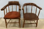 Two Vintage barrel chairs, spindle back, one missing spindles, has wear. Two Vintage barrel chairs, spindle back, one missing spindles, has wear.