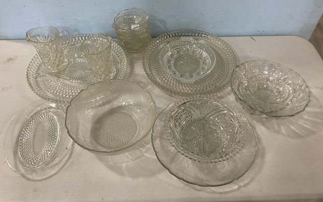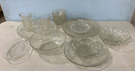 Group of Pressed Glass Serving Pieces, small berry bowls, pitchers, round tray, serving bowls, leaf dish. Group of Pressed Glass Serving Pieces, small berry bowls, pitchers, round tray, serving bowls, leaf dish.