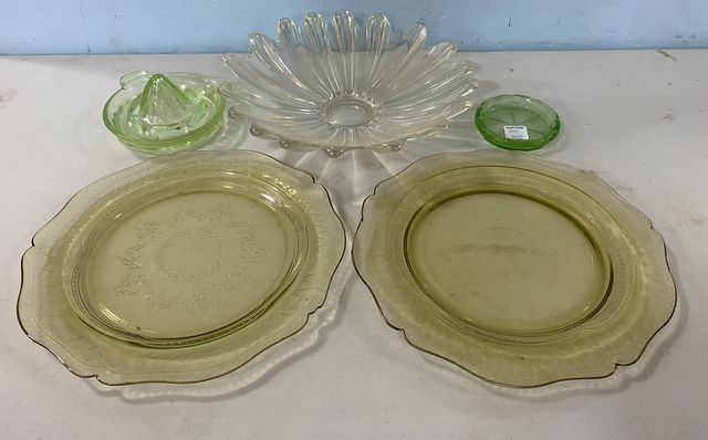 1172 Depression Glass Plates, Glass Centerpiece Fruit Bowl, Squeezer, Dish