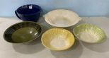 Four ceramic and porcelain serving bowls, one has crack, plastic mixer pitcher. Four ceramic and porcelain serving bowls, one has crack, plastic mixer pitcher.