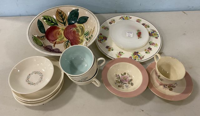 Group of Ceramic and Porcelain Serve Ware, ceramic salad bowl, porcelain hot plate, Fortune Cups and saucers, Homer Laughlin bowl, cup, saucer. Group of Ceramic and Porcelain Serve Ware, ceramic salad bowl, porcelain hot plate, Fortune Cups and saucers, Homer Laughlin bowl, cup, saucer.