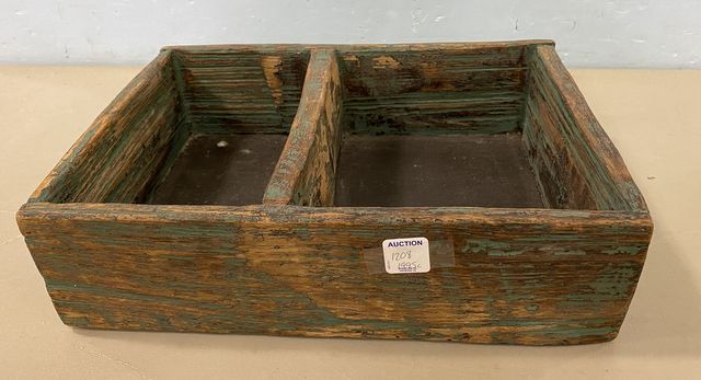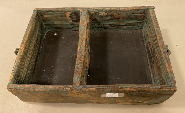Primitive style storage box, divided section, metal handles, aged painted, 14"w. Primitive style storage box, divided section, metal handles, aged painted, 14"w.