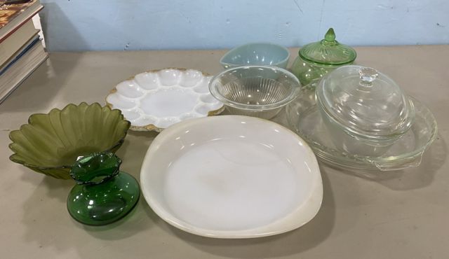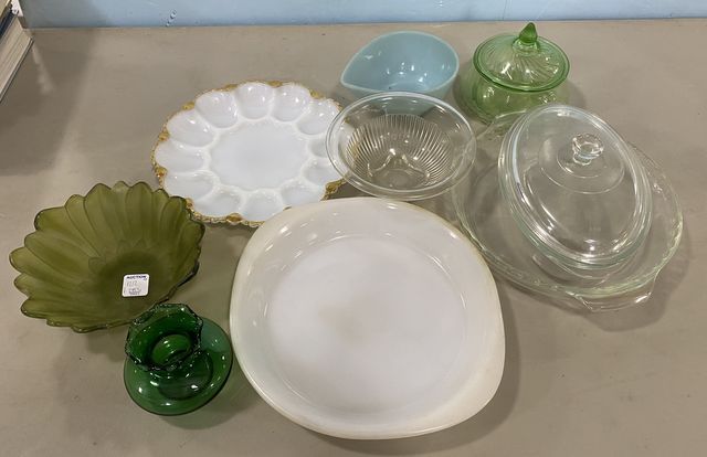 Milk Glass egg tray, green leaf bowl, green small vase, clear glass covered dish, pan. Milk Glass egg tray, green leaf bowl, green small vase, clear glass covered dish, pan.
