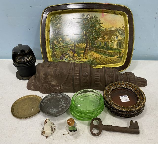 American Homestead Autumn tray, Egyptian wall ceramic face plaque, mounted compass, small plates, figurines, decorative key. American Homestead Autumn tray, Egyptian wall ceramic face plaque, mounted compass, small plates, figurines, decorative key.