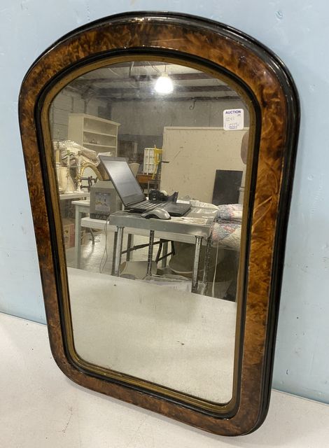 Burl Finish wall mirror, wood frame with plaster, has small damage spots, 27"h., 16"w. Burl Finish wall mirror, wood frame with plaster, has small damage spots, 27"h., 16"w.