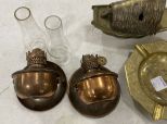 1245 Two Brass Wall Lanterns, Brass Asian Boat Incense, and Etched Ashtray