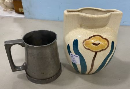 Signed Pottery Vase, floral pattern, and Chinese Pewter Mug. Signed Pottery Vase, floral pattern, and Chinese Pewter Mug.
