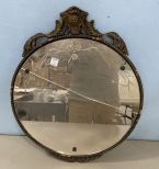 Vintage Round Wood Framed Mirror, wood carved crests, cracked mirror, 23" Vintage Round Wood Framed Mirror, wood carved crests, cracked mirror, 23"