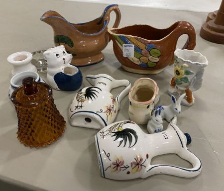 Pottery hand painted pitchers, cat vase, pepper wall art, amber candle shade, porcelain vase, rabbit figurines. Pottery hand painted pitchers, cat vase, pepper wall art, amber candle shade, porcelain vase, rabbit figurines.