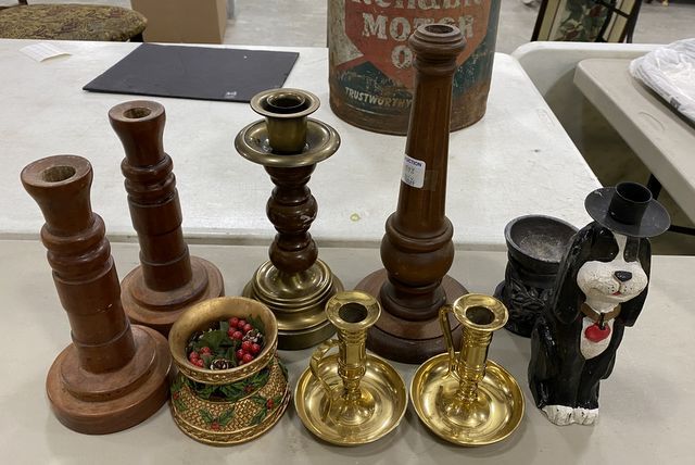 9 Candle holders, wood candle sticks, brass candle holders, dog holder, resin candle base. 9 Candle holders, wood candle sticks, brass candle holders, dog holder, resin candle base.