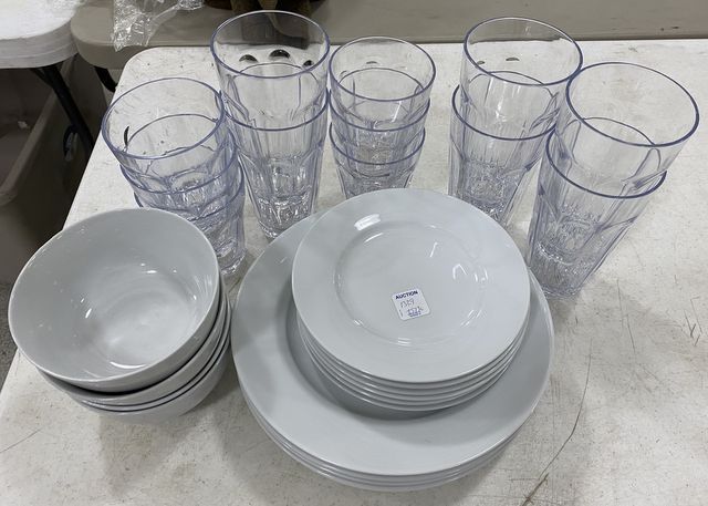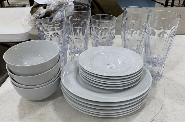 Amazon Basics Dinner Ware, 6 dinner plates, 5 salad plates, 4 bowls, and Plastic Drinking Cups. Amazon Basics Dinner Ware, 6 dinner plates, 5 salad plates, 4 bowls, and Plastic Drinking Cups.