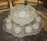 23"dia press glass serving tray with punch bowl and nine cups. 23"dia press glass serving tray with punch bowl and nine cups.