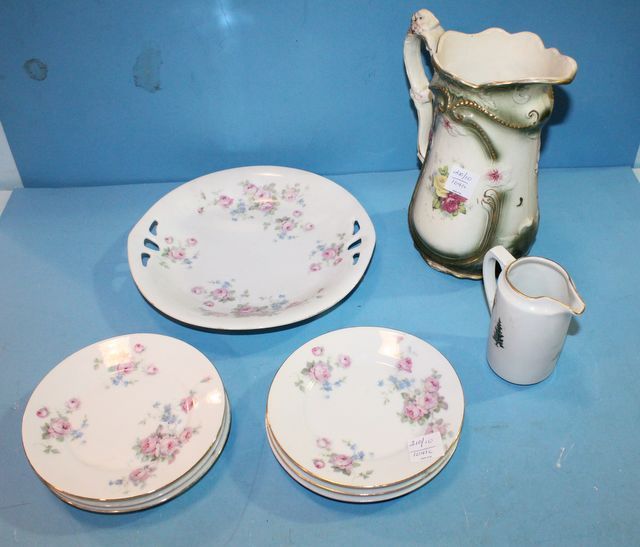 210 Seven Handpainted Germany Saucers, matching plate, pitcher, and ceramic pitcher.