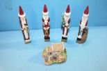 Four Wooden Santa Claws Christmas Ornaments, Resin Cottage 4"h. Four Wooden Santa Claws Christmas Ornaments, Resin Cottage 4"h.