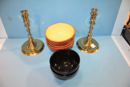 Pair of Brass Candlesticks 10"h., and Five Pottery Bowls Pair of Brass Candlesticks 10"h., and Five Pottery Bowls