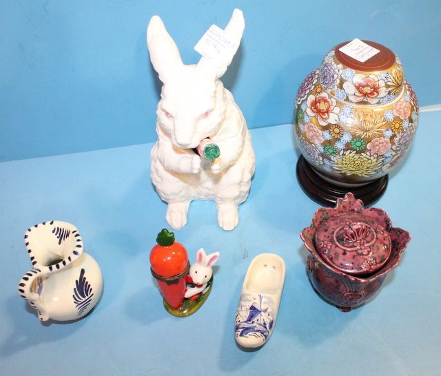 Halden group porcelain rabbit 7"h, oriental vase on stand 5"h, porcelain rabbit with carrot, delft shoe and pitcher. Halden group porcelain rabbit 7"h, oriental vase on stand 5"h, porcelain rabbit with carrot, delft shoe and pitcher.