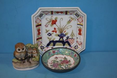 348 Oriental Style Dish, Bisque Figure of Owls, and Dish
