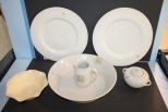 Six Pottery Pieces which include 2 large round trays, large salad serving bowl, creamer, sugar, small 4" bowl Six Pottery Pieces which include 2 large round trays, large salad serving bowl, creamer, sugar, small 4" bowl