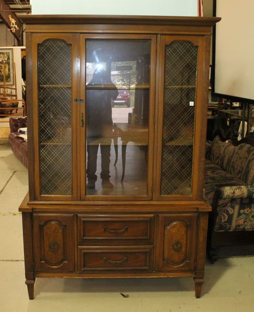 Vintage China Cabinet with center glass door, two side glass/mesh panels, two drawers, two doors 50"w, 17"d, 75"h Vintage China Cabinet with center glass door, two side glass/mesh panels, two drawers, two doors 50"w, 17"d, 75"h