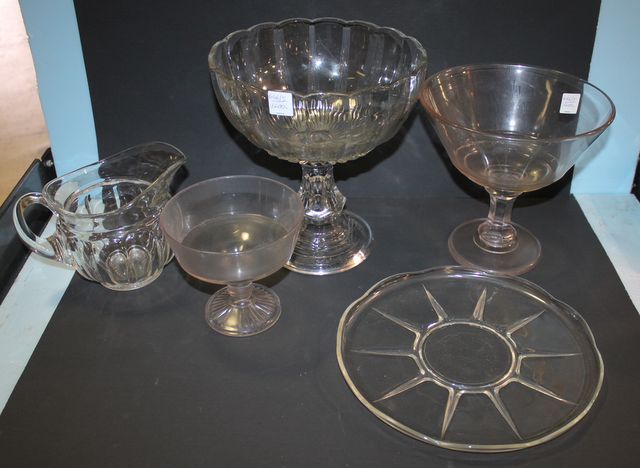 Early glass pieces including punch bowl 9 1/8" diameter, pitcher, two fruit bowls, serving tray Early glass pieces including punch bowl 9 1/8" diameter, pitcher, two fruit bowls, serving tray
