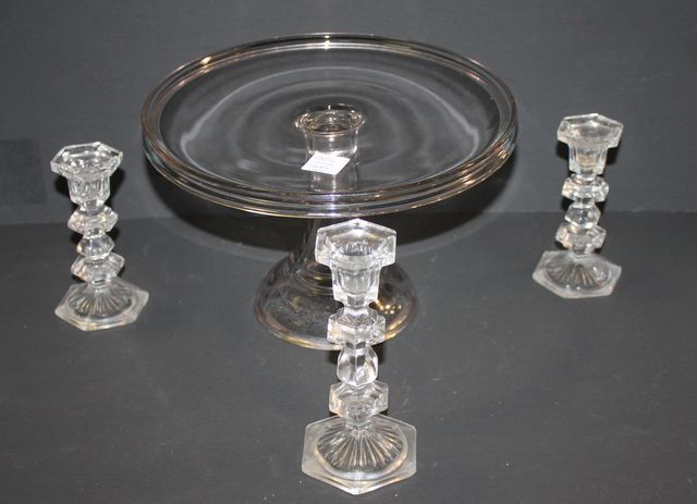 Glass Cake Stand 10 1/2"diameter, 3 glass candlesticks 6 1/2" Glass Cake Stand 10 1/2"diameter, 3 glass candlesticks 6 1/2"