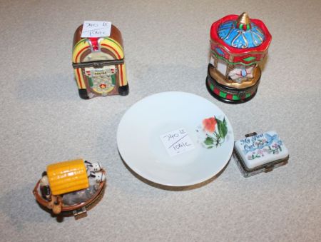4 Porcelain Boxes - My First Curl, Noah's Ark, Horses, and Jukebox; Small Limoges Plate 4 Porcelain Boxes - My First Curl, Noah's Ark, Horses, and Jukebox; Small Limoges Plate