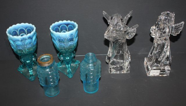 Pair Blue Pauline Vases, Blue Salt and Pepper, Clear Angels Pair Blue Pauline Vases, Blue Salt and Pepper, Clear Angels
