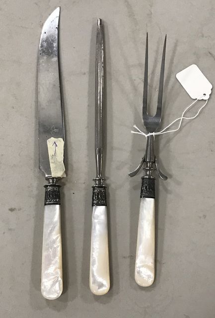 208 3 Peice Marked Sterling Banded Mother of Pearl Carving Set