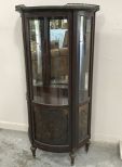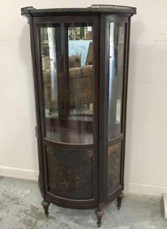 French style single door curio cabinet, glass shelves, mirrored back, brass ornate top gallery, door needs some adjusting, no key, has European scene on bottom panels, has wood wear, 62"h., 32"w., 16"d. French style single door curio cabinet, glass shelves, mirrored back, brass ornate top gallery, door needs some adjusting, no key, has European scene on bottom panels, has wood wear, 62"h., 32"w., 16"d.
