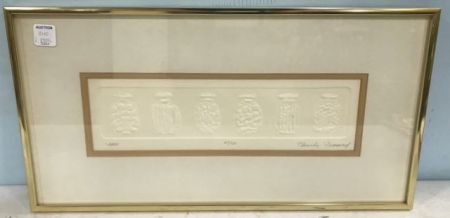 Framed, Jars paper art, signed Blanche Desmond, 10"h., 20"w. Blanche grew up in Magnolia, MS, taught art at Southeastern Louisiana, married Dr. Blair Batson. She made her own paper and copper etchings for the paper art. Framed, Jars paper art, signed Blanche Desmond, 10"h., 20"w. Blanche grew up in Magnolia, MS, taught art at Southeastern Louisiana, married Dr. Blair Batson. She made her own paper and copper etchings for the paper art.