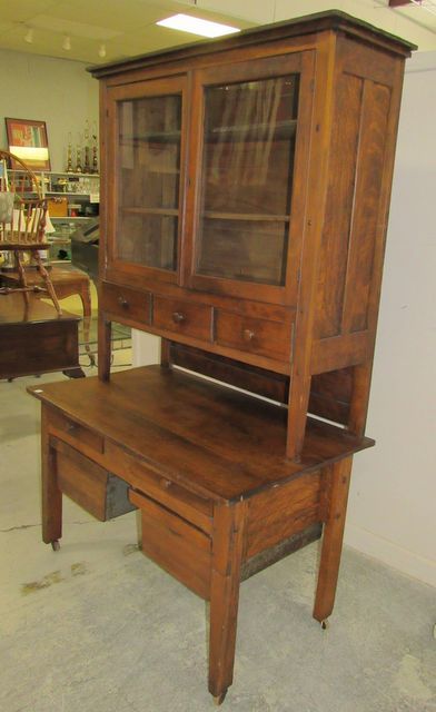 This piece is early primitive, two piece baker's cabinet, top is double glass door with storage shelf, bottom has two drawers and storage bins, needs tightening, bottom piece is a little loose structurally, 77"h., 46"w., 27"d. This piece is early primitive, two piece baker's cabinet, top is double glass door with storage shelf, bottom has two drawers and storage bins, needs tightening, bottom piece is a little loose structurally, 77"h., 46"w., 27"d.