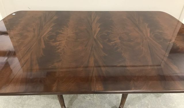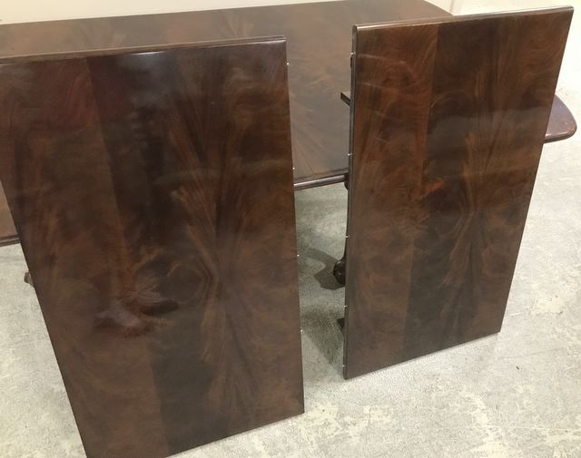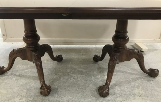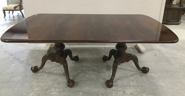 Double pedestal burl mahogany dining table, two leaves, ball-n-claw, 6 legs, 29"h., 76"L., 55"w. Double pedestal burl mahogany dining table, two leaves, ball-n-claw, 6 legs, 29"h., 76"L., 55"w.